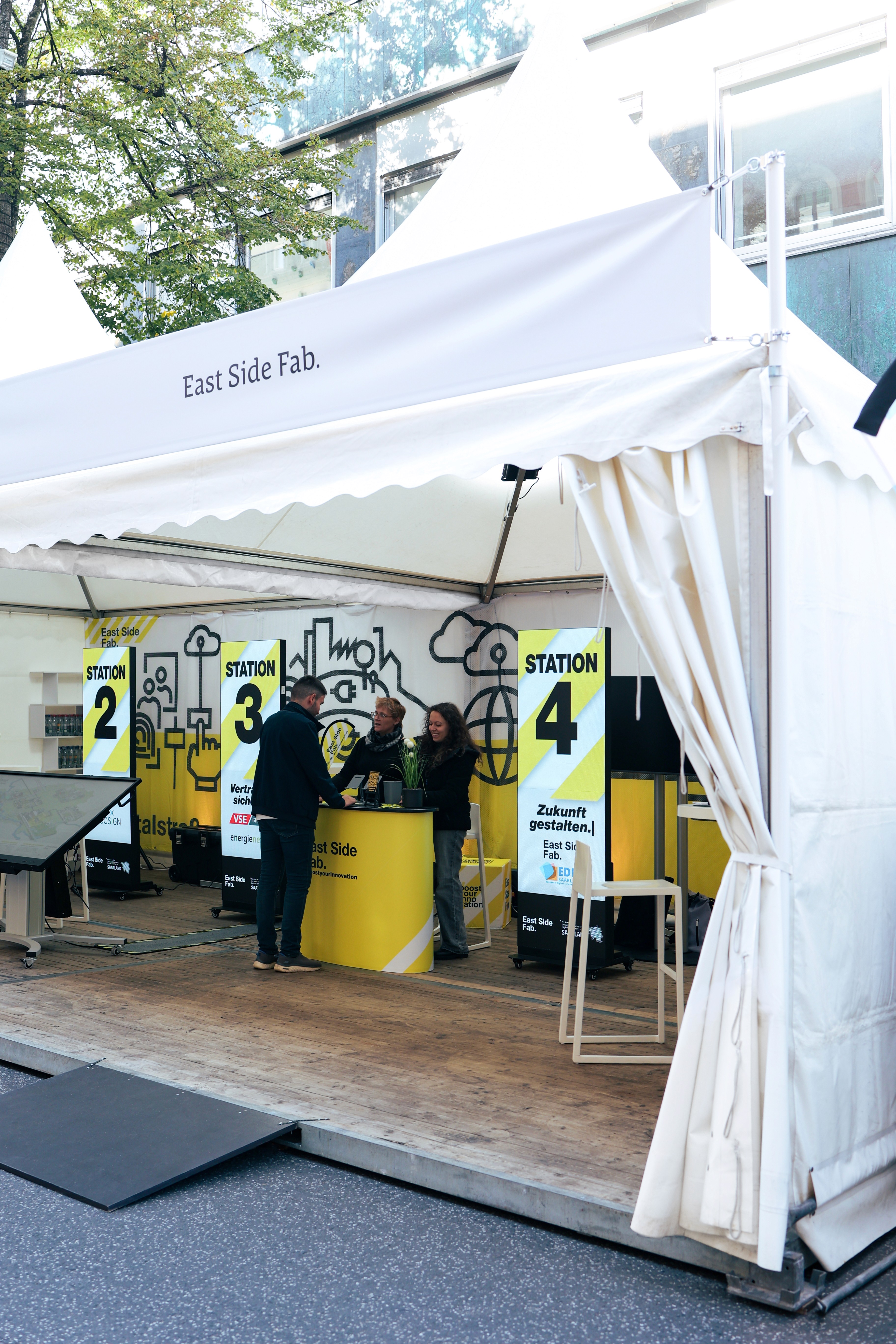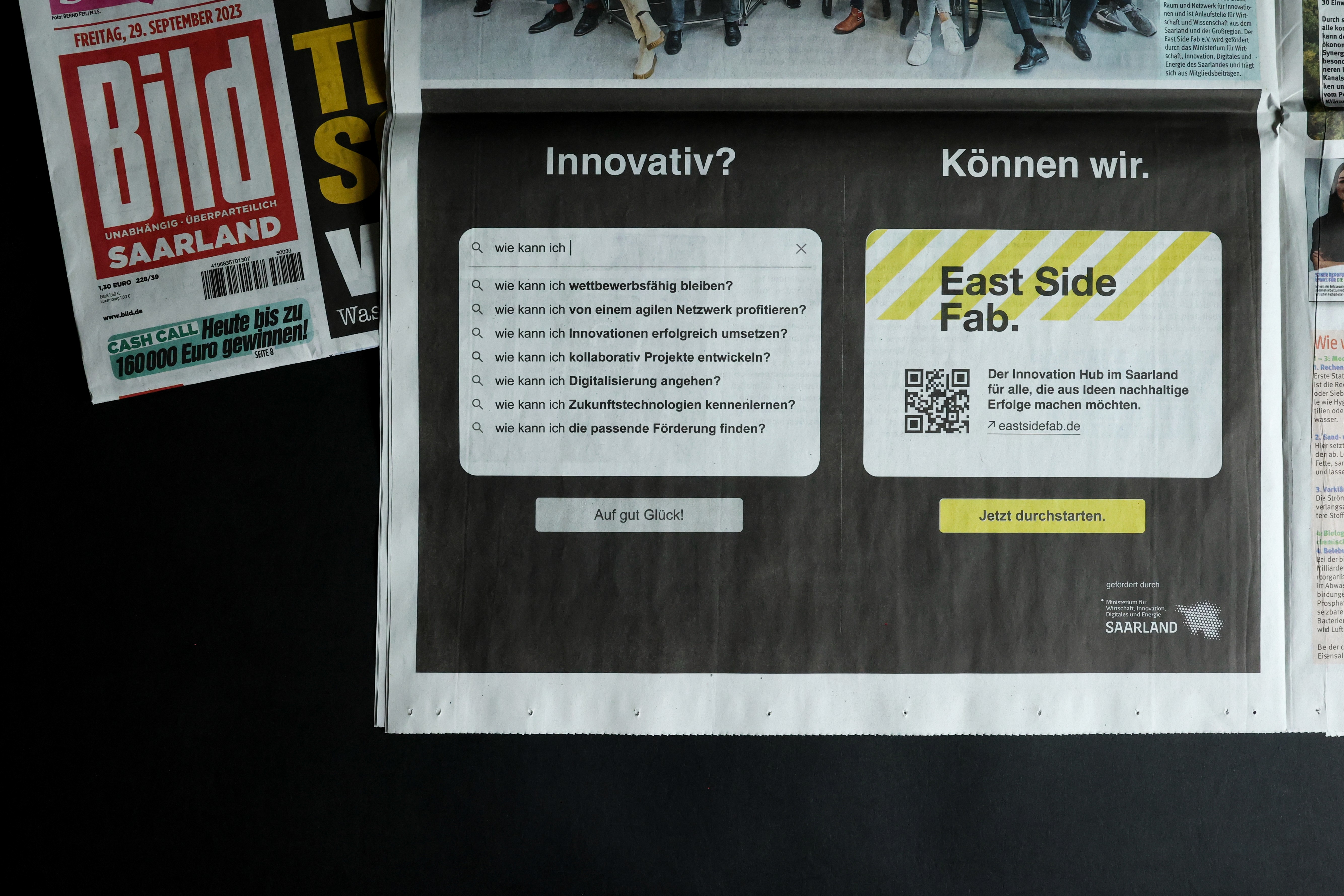 Das East Side Fab. ist ein Innovation Hub, der Netzwerke zwischen Wirtschaft, Politik und Forschung sowie Neugründungen fördert. Die Zusammenarbeit begann mit der Erarbeitung grundlegender Gestaltungsrichtlinien auf Basis der vorhandenen Kommunikationsmittel: Logoeinsatz, Hausfarbe, typografische Auszeichnung, Formate und Abstände. Darauf aufbauend entstanden zahlreiche Kommunikationsmittel, zuletzt eine umweltfreundlich produzierte Design Thinking Tool Box mit Falt-Broschüre, Plakaten, Business Model Canvas, Persona-Spreadsheets, Kartennotizen und Aufklebern. Die Materialien wurden nachhaltig produziert in einer nach EMAS (ISO 14001) zertifizierten Druckerei mit Ökofarben auf Pflanzenölbasis und Blauer Engel-zertifiziertem Papier. Die von mir entwickelten rasterbasierten Icons sind flexibel erweiterbar und visualisieren die Themen des Hubs, beispielsweise innerhalb einer 10 Meter langen Grafik der “Digitalstraße” zum Tag der Deutschen Einheit 2025.