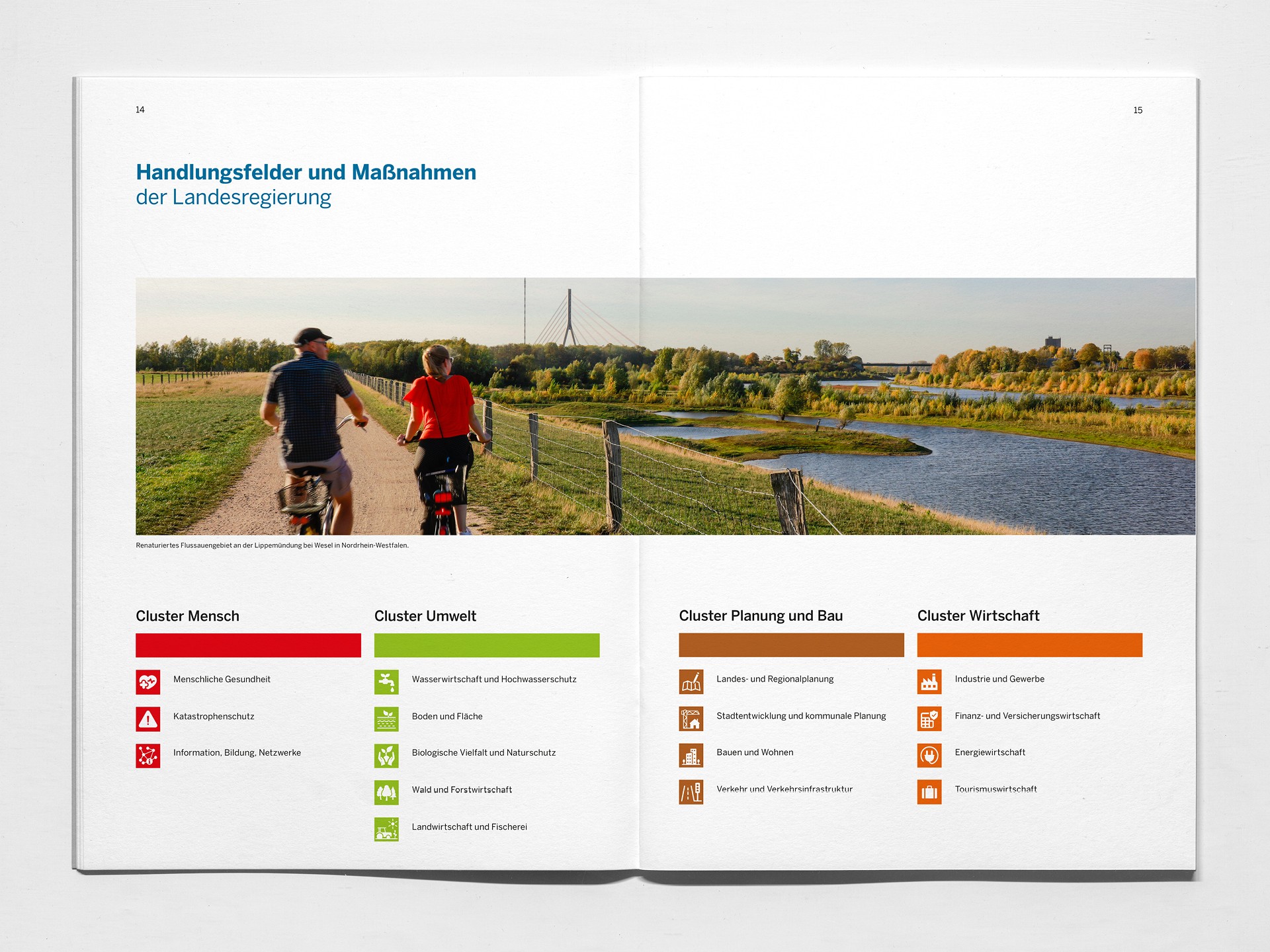 Nordrhein-Westfalen hat seit 2021 ein Klimaanpassungsgesetz und schreibt seine Klimaanpassungsstrategie alle fünf Jahre unter Berücksichtigung neuer wissenschaftlicher Erkenntnisse fort. Für die prozessbegleitende Agentur Ramboll Management Consulting durfte ich die Broschüre des Ministerium für Umwelt, Naturschutz und Verkehr des Landes Nordrhein-Westfalen umsetzen. 110 Maßnahmen in den Bereichen Infrastruktur, Gesundheit und Landwirtschaft bieten eine Antwort auf die sich häufenden Krisenszenarien in Folge der Erdüberhitzung. In Abstimmung mit den zuständigen Ressorts war ich neben Layout, Satz und Barrierefreiheit nach PDF/UA auch für die Recherche und Auswahl visuell und inhaltlich geeigneter Bilder mit hohem Bezug zur Region zuständig.